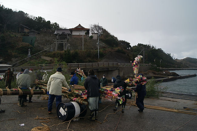 2016年1月3日、手結の男性たちが、竹と絵、そして鯛の模型2体からなる巨大な構築物を立ち上げようとしているところに、私は偶然、出くわしたのです。それは、大漁を祈願する正月の神事「とんどさん」でした。
